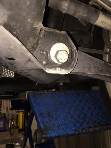 こちらは右リヤアームの付け根になります。偏心したボルトが付いている箇所ですのでアライメント調整箇所になります。